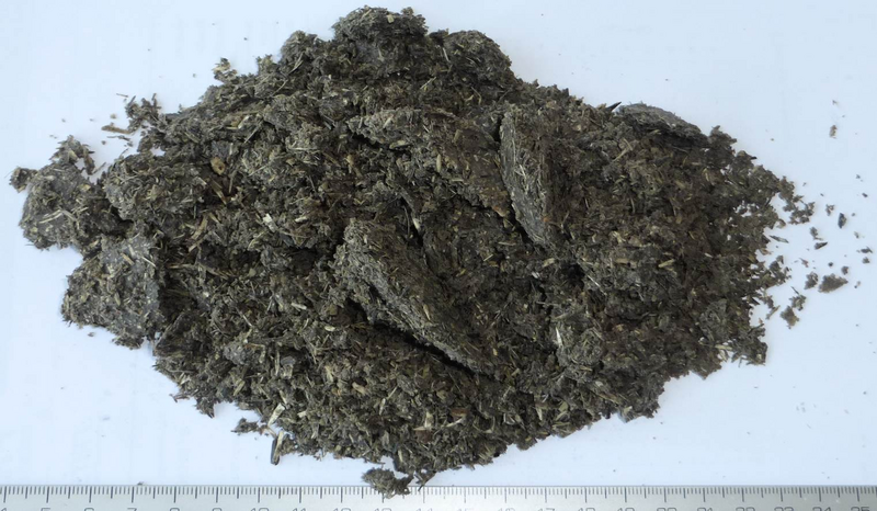 After 20 minutes of grinding, we interrupted the grinding process and packed the sample into a plastic bottle. Still some longer fibers (~ 1-2 mm length) were spotted at this point of comminution. |