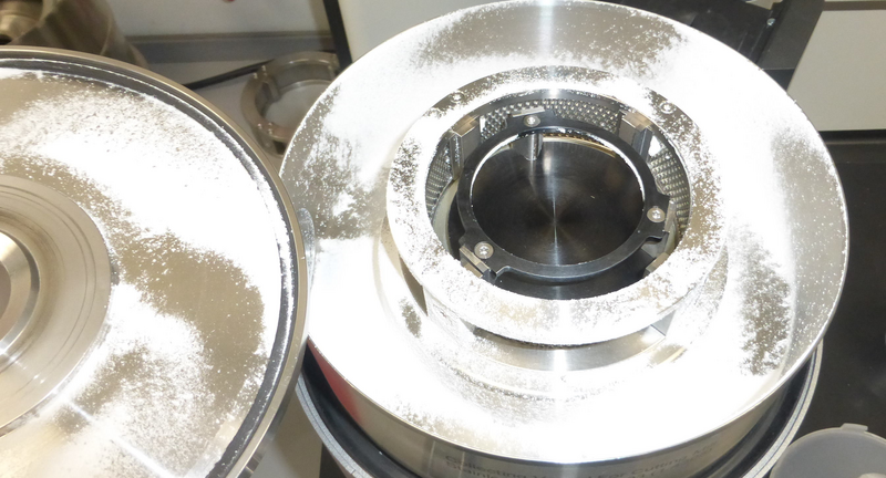 With our first trial, we ground the sample < 1 mm fine to give a wide spread distribution of particles, as desired. If the start size of sample would be larger, this type of grinding can also be performed as a pre-grinding step.