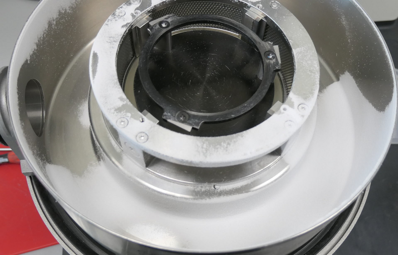 This batch was slowly fed into the feeding funnel of the mill. The grinding sound was typical smooth. It took us 200 seconds until the complete sample was transferred into the grinding chamber. The temperature of the system did not rose significantly. Surely even higher feeding speeds can be realized. The max. throughput should be evaluated on the customer side.