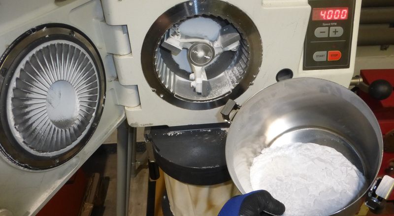 | Desired Cross Beater Mill PULVERISETTE 16 can be used for grinding of strontium nitrate. Only with 0,5 mm trapezoidal perforated bottom sieve, higher amounts of sample can be ground. |