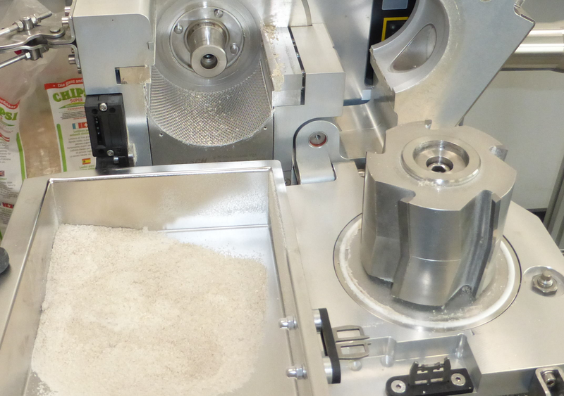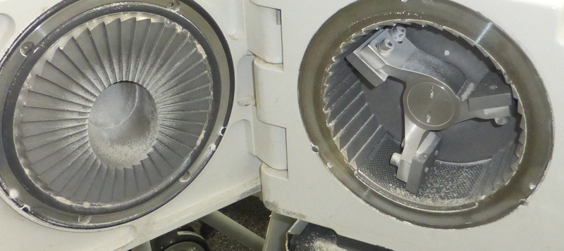 We opened the grinding chamber; ribs and rotor were only slightly polluted. Surely higher amounts of sample could be ground this way. A bit of ground sample remained below the grinding insert and could be brushed off rapidly to maximize the output. Without brushing out, we found almost 84 grams of ground sample material inside the collecting vessel.